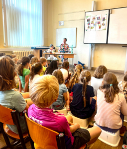 In der Aula versammelten sich die Kinder der dritten und vierten Klassen voller Vorfreude. Maria Parr las ein Kapitel aus ihrem neuesten Buch Himbeereis am Fluss vor und zog die jungen Zuhörerinnen und Zuhörer mit ihrer lebendigen Art sofort in den Bann. Anschließend durften die Kinder Fragen stellen – zur Geschichte, zu ihrem Leben als Autorin und natürlich zu den Figuren ihrer Bücher.